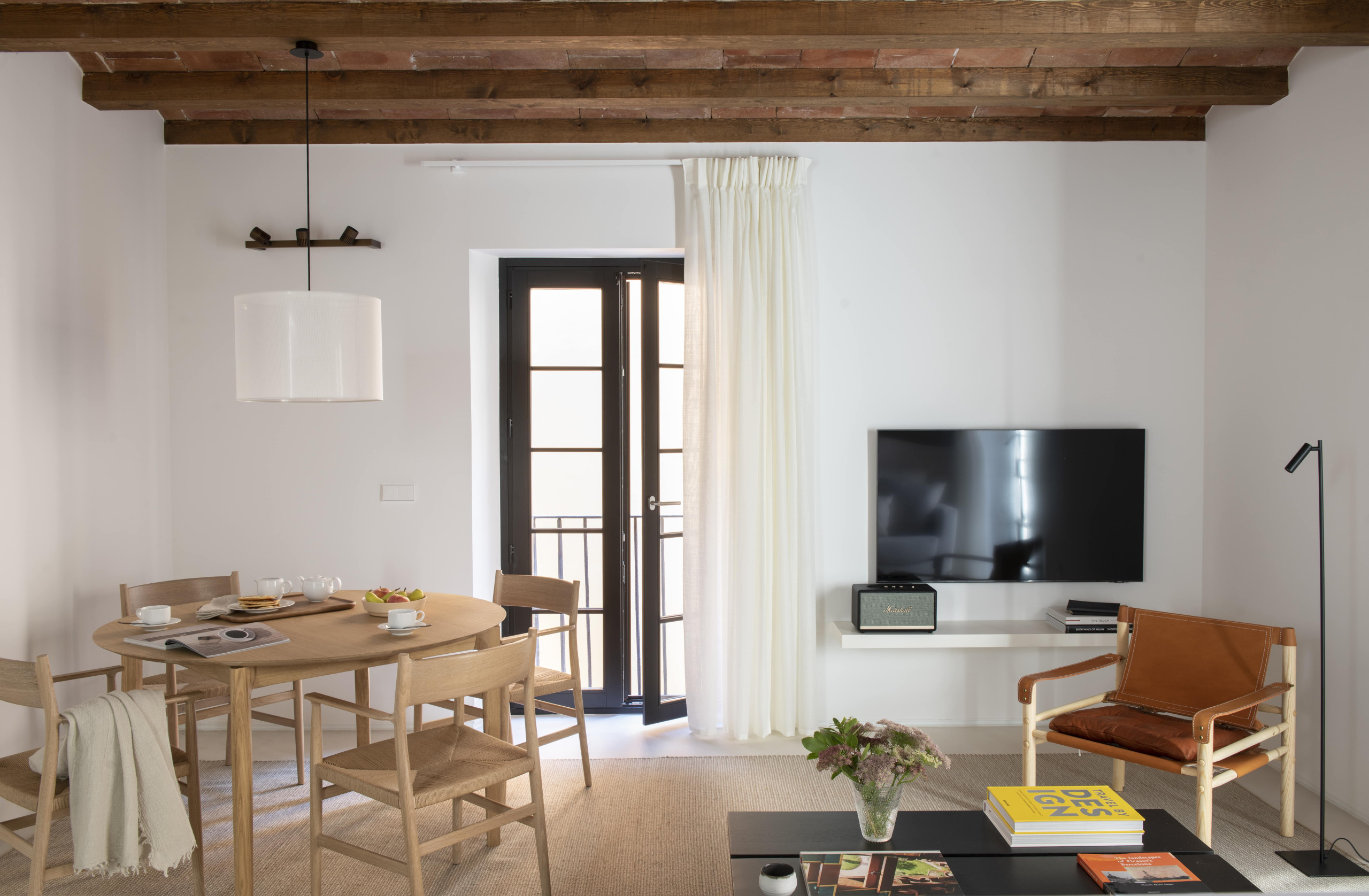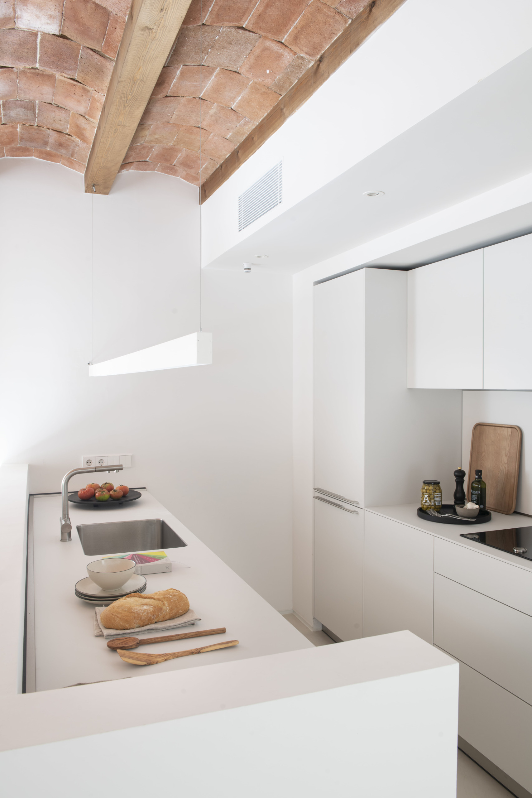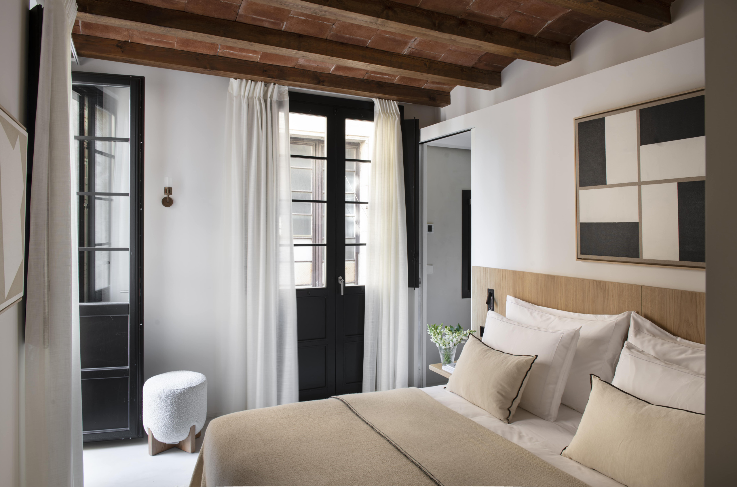 Apartamento de alta gama de 120m2 con 2 dormitorios dobles, ambos con baños en suite, y uno individual. Además de un salón abierto que se comunica directamente con una cocina Bulthaup, y un pequeño balcón típico a la calle Mercè.